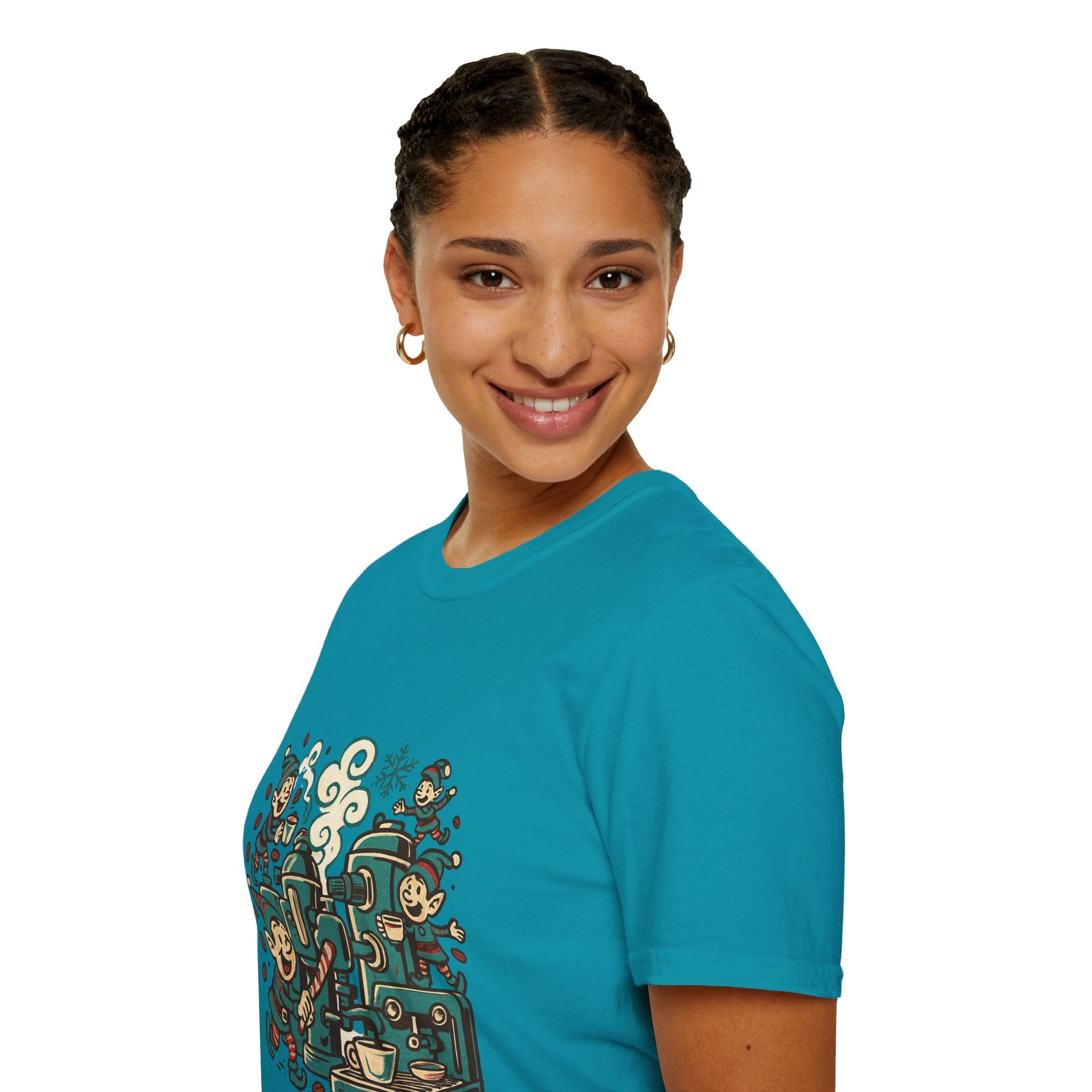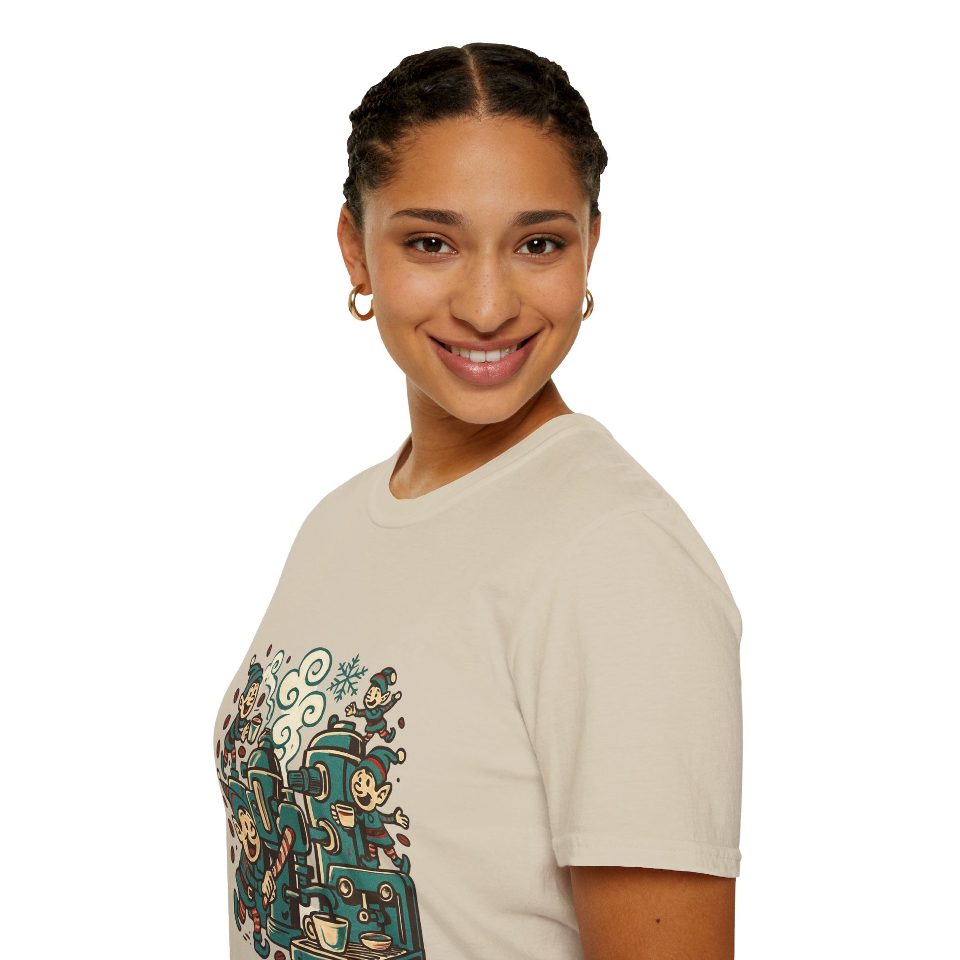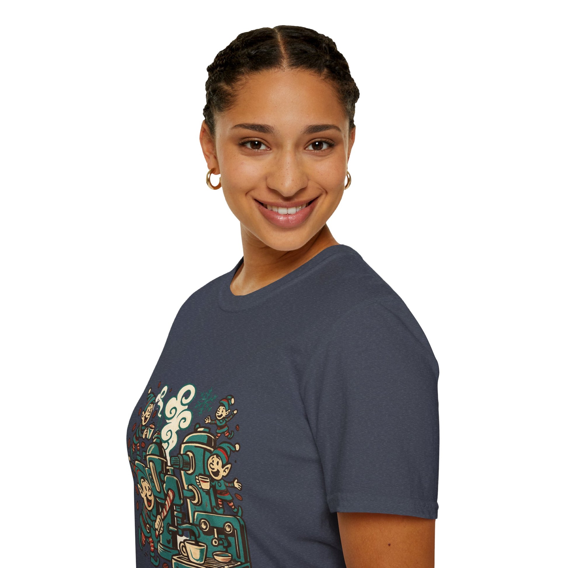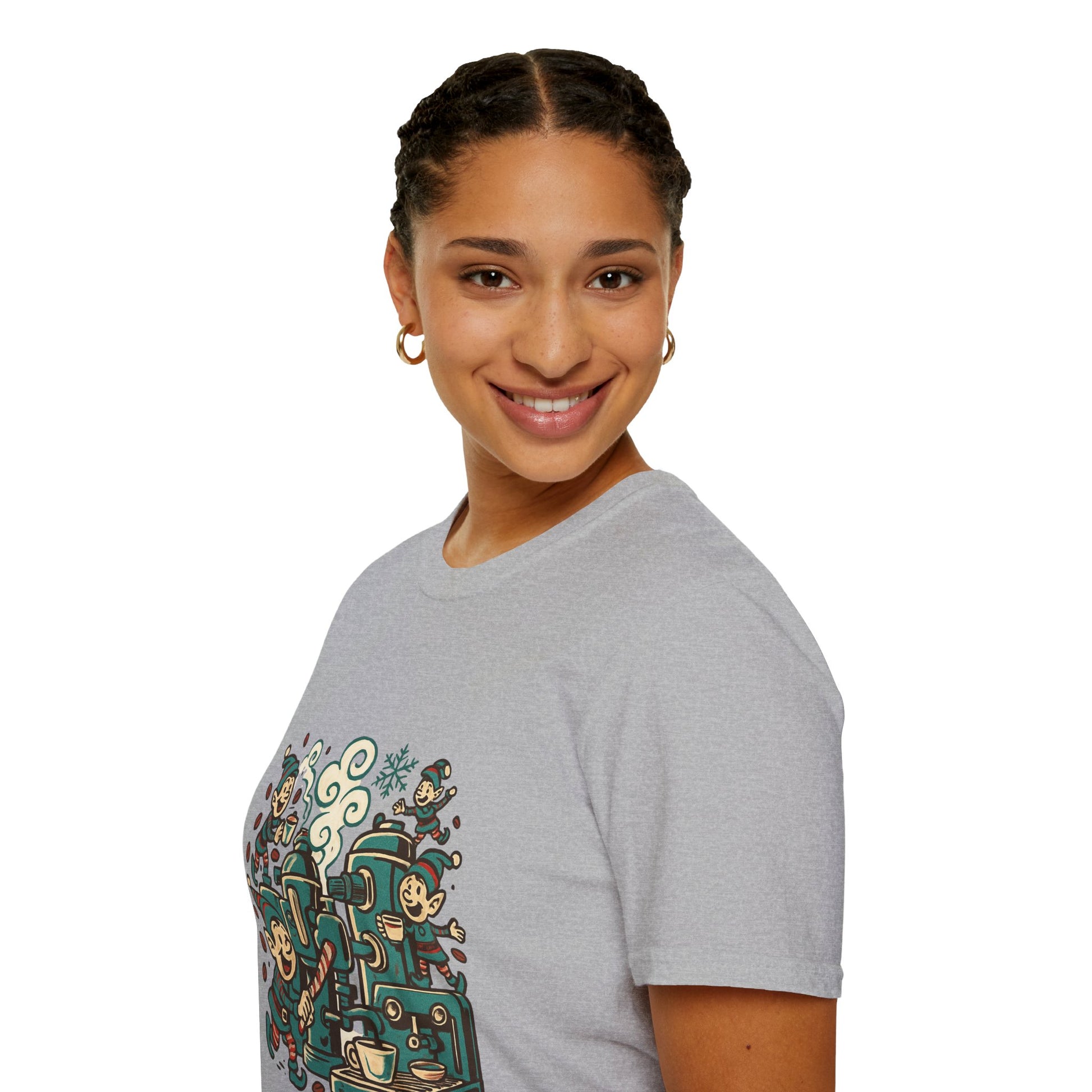 Step into Santa’s coffee workshop with the Elf Espresso Factory tee! Featuring busy Christmas elves brewing holiday joy with candy canes and steaming espresso, this shirt is perfect for caffeine lovers who believe coffee is pure Christmas magic.